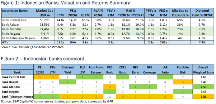 Victor Galliano upgrades Bank Mandiri and Bank Negara to Buy on better-than-expected credit quality, attractive valuations and signs the government is reining in market-unfriendly policies. Both banks screen well on fundamentals (fig 1) and in his proprietary scorecard (fig 2). Mandiri is his top pick, driven by strong credit quality and solid returns, supported by mid-ranking valuations. Low NPLs underpin a declining cost of risk and improving post-provision returns, while returns relative to valuation are very attractive. With PBV near a three-year low and bond yields elevated, he sees scope for a valuation uplift if yields ease. Negara’s valuations are close to deep value and, although return trends remain uninspiring, it has the lowest MSME exposure of the peer group and second best NPL coverage.