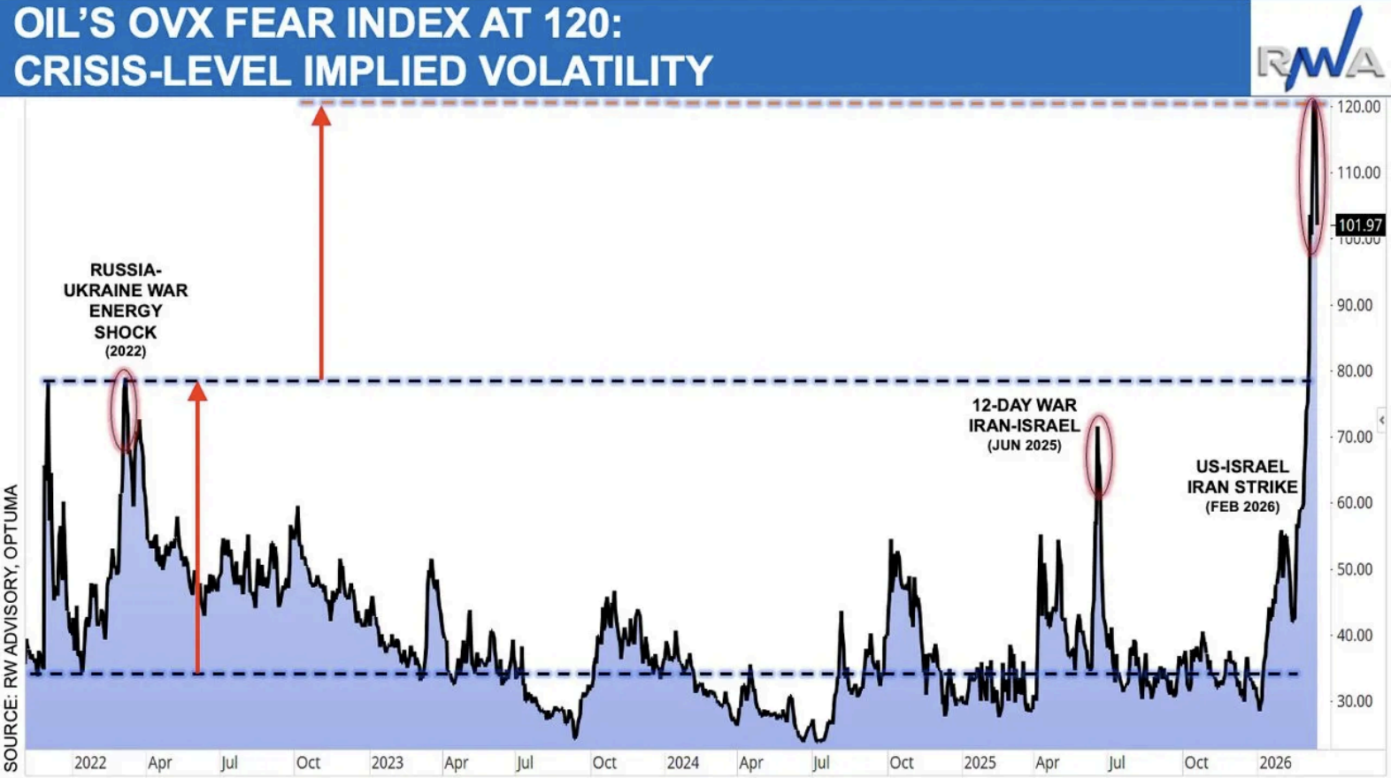 Markets have transitioned into a new, high-volatility regime where prolonged conflict is now the base case. The Oil Volatility index (OVC) has surged toward 120, in line with Ron William’s projected target, reflecting crisis-level conditions and implying ~35% monthly price swings (see chart). Ron sees the possibility of prices heading to $200/barrel as markets transition from localised disruption to broader macro dislocation, a possibility that historical precedent presents as highly plausible. This reflects a larger, geopolitically driven cycle instead of a short-term spike, and the dynamic is unfolding within a broader commodity super-cycle framework: gold leads during monetary stress, copper confirms late-cycle growth pressure, and Energy ETF (XLE) is already up +35% YTD in line with Ron’s tactical call. The current environment increasingly resembles a 1970s-style regime of rolling inflation waves, with stagflation risks re-emerging.