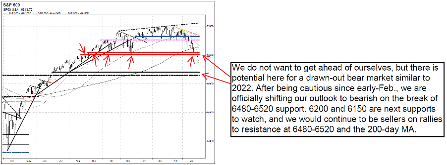 The Vermilion team are officially downgrading their outlook to bearish with the S&P500 (SPX) violating major support at 6480-6520, Nasdaq futures (NQ) violating 24,000 support, and the Russell 2000 (IWM) breaking down below crucial $245 support. This comes the team downgraded their outlook to neutral early in March. Concerns that they discussed since early-February stemmed from deteriorating market dynamics, and ever since then they been concerned about a deeper pullback, likely to 6720-6776, 6690, or 6480-6520 on SPX, while also discussing since mid-March how downside capitulation is likely needed before finding a reliable bottom. With continued deterioration in market dynamics, their report last week discussed how they were closely watching for a breakdown below 6480 and that the SPX likes to test the 200-day MA as resistance (from below) before continuing lower, and this is likely what happened on 3/23/26. 6200 and 6150 are the next supports to watch, and they would continue to be sellers on any rallies to 6480-6520 and 200-day MA resistances.