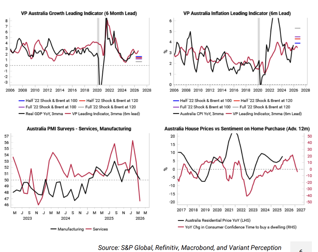 The Variant Perception stress-tested countries to identify the ones most resilient to energy shocks, with Australia coming out on top thanks to its coal and LNG exports. The team’s range of scenarios show that inflation should remain below the 2022/23 highs. This outlook should reinforce the RBA’s ongoing hawkish stance; at face value, a hawkish RBA and positive terms of trade shift would point to a stronger AUD, but there are signs that a bigger downside growth shock is possible. Both services and manufacturing PMIs were already rolling over before the Iran conflict, which should give the RBA reason for pause, and housing sentiment is weaker today than 3 years ago. Long AUD has been a popular trade that has worked well YTD, but it is going through a correction now given elevated long speculative positioning and a previous LPPL sell signal. The team are waiting for their tactical models to signal a better time to go long the AUD again.