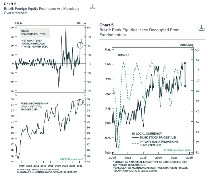 Should investors buy the dip? The BCA team think not. The recent bull market has been fuelled by unsustainable foreign inflows and is massively overstretched (see left chart). The divergence between rising stock prices and worsening macro fundamentals has become untenable (right chart) – investors are too sanguine. Domestic demand will worsen, with odds of a recession rising for the next 6-12 months. The only factor that can prevent such a drastic economic slowdown is major fiscal easing, yet this would cause markets to sell off. Some investors argue that high commodity prices will bail out Brazil, which is theoretically correct, yet in the past this has brought down equities due to the global growth recession it causes. Commodities also matter far less to Brazil’s stock market today. Stay underweight Brazil in equity and fixed-income portfolios. The team also recommend a new short-term trade (three-month horizon): Pay 10-year Brazilian swap rates.